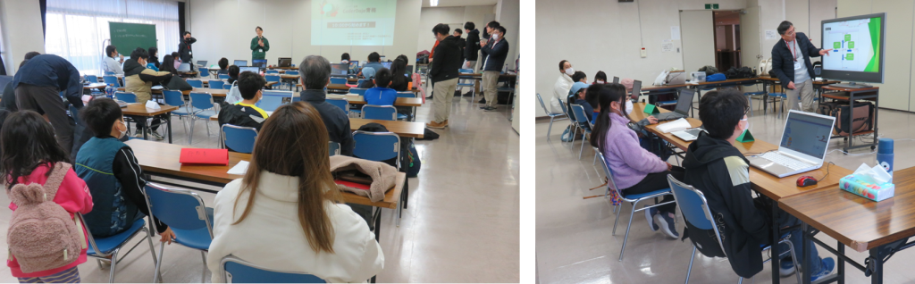 CoderDojo青梅では初級・中級コースと初めて参加する入門コースで分かれて、二つの部屋でプログラミングに取り組んでいます。講師はメンターの晴山さんと鳥居塚さん。