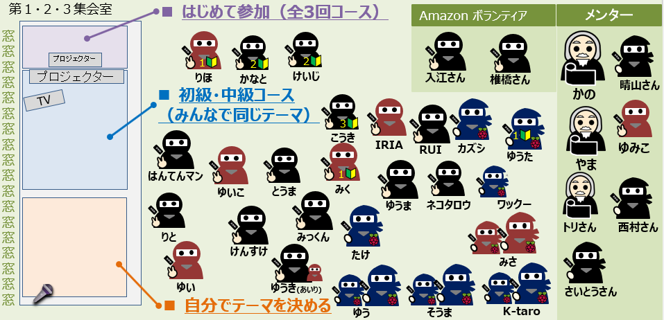 今月はCoderDojo青梅メンターとamazonボランティアの合計8名が子どもたちと一緒にイベントを楽しみました。amazon椎橋さん、初めてのボランティア参加なのに完璧なメンタリングをしていただいて感謝。