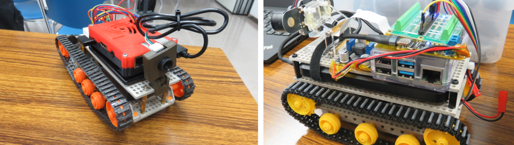 今月はメンターの2台。左がラズパイケースを3Dプリンター出力したものでVRカメラで運転します。右がニンジャのパパさんが開発したモバイルバッテリーで駆動する電源搭載という魔改造。乾電池不要なので軽量。電源は9Vをモーター用6Vとラズパイ用5Vに分岐・高圧している大人の改造(燃えたら大変なので、子どもたちはひとりで電源つくらないでね)