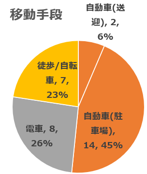 アンケートは31回答あり、51%が自動車なので少なくとも15台分くらいの駐車場を確保したい。3年前の自動車は80%だったので、慣れたのかな、電車や自転車での移動が増えたようです。